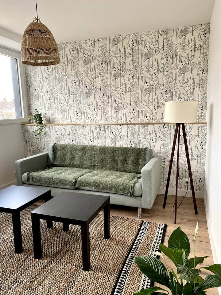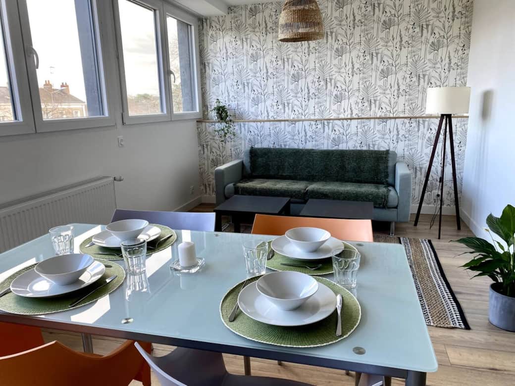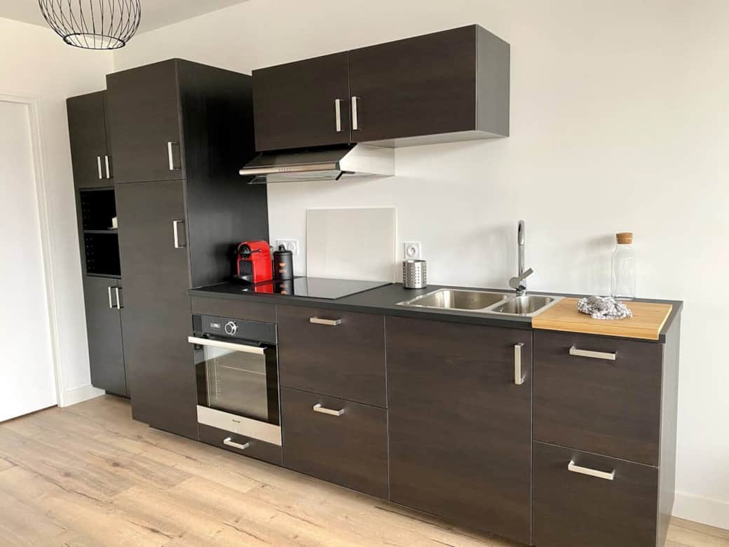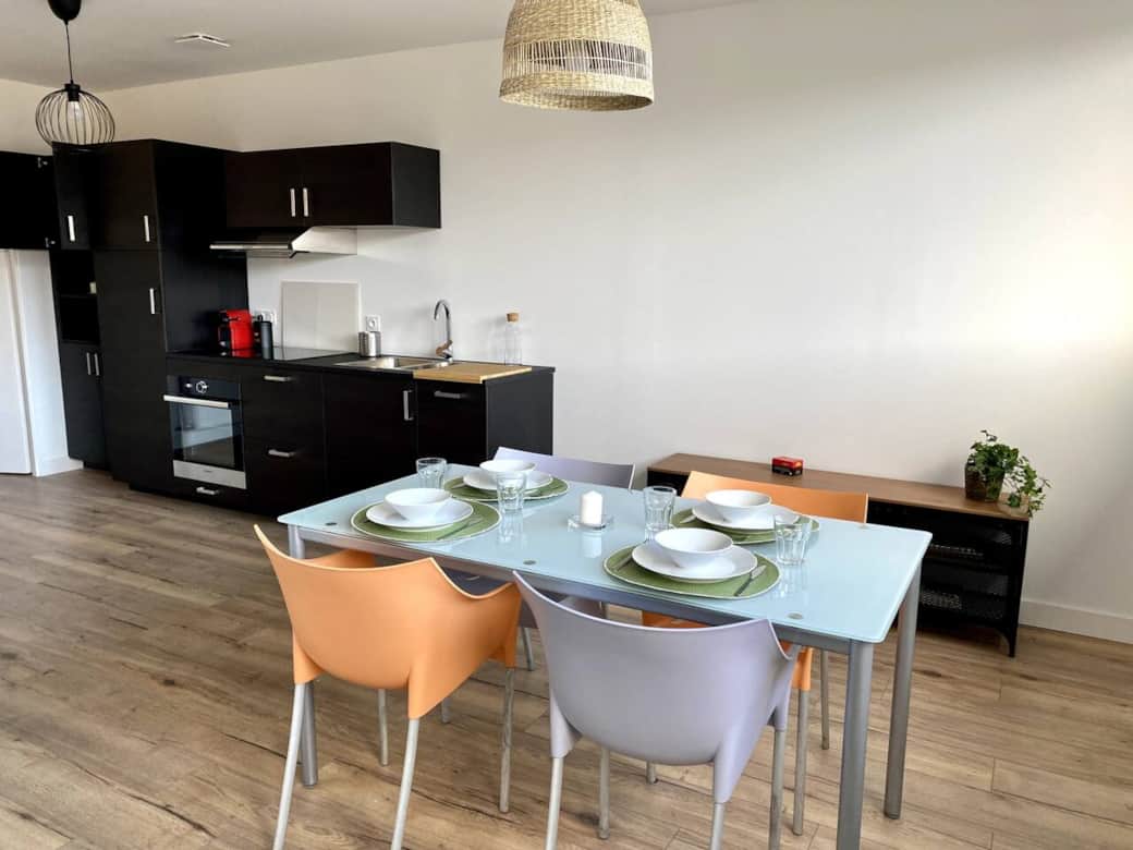 Appartement de 65 m2 avec 2 chambres et 1 grand lits dans chaque chambre, une salle de bain avec douche , une cuisine équipée avec salon ouvert et un wc séparé.